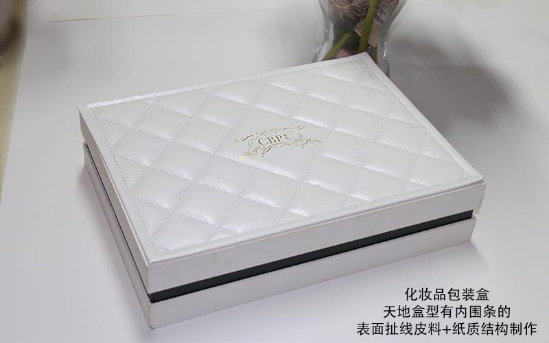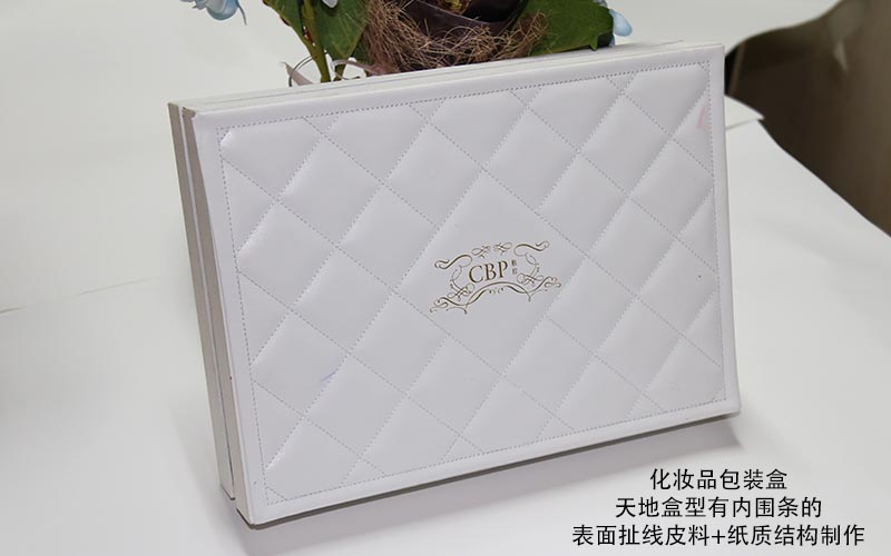 材質:天盒表面扯線白色皮質上面文字LOGO燙金,皮質半成品做好粘在天盒上面,整款盒子都用白色帶(dài)紋路的特種紙手工裱1600G雙灰闆,底盒的内圍條用黑卡紙裱1500G雙灰闆,盒子内部裝EVA植絨(róng)内托,手工制作
